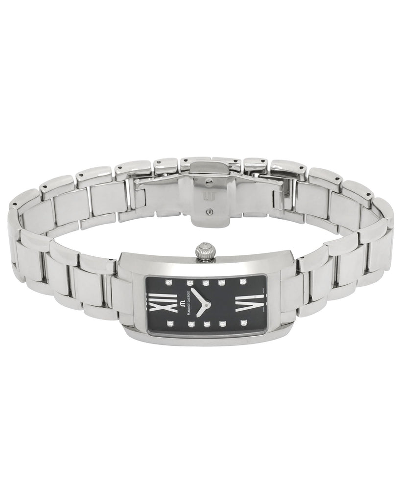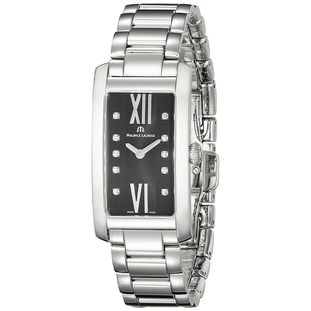 Maurice Lacroix Fiaba - slim and feminine, fashionable and contemporary with a touch of classic. Ergonomically designed rectangular shaped stainless steel case with sapphire crystal. Swiss ETA quartz movement. Black dial with Roman and diamond markers. Stainless steel bracelet.