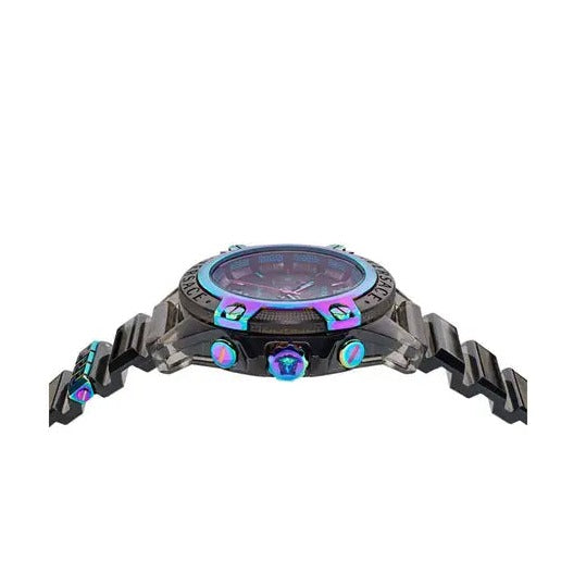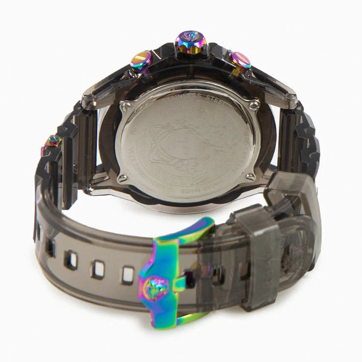 The coolest watch that meets the anticipation of an audience looking for something new and trendy. The Icon Active conveys an urban and sporty look with its transparency and color. Absolutely and exquisitely iconic, design elements include the metal loop on the strap that recalls the Greek Key, a Medusa at 12H and an internal Greek Key that can be seen from the curvature of the inner dial ring.