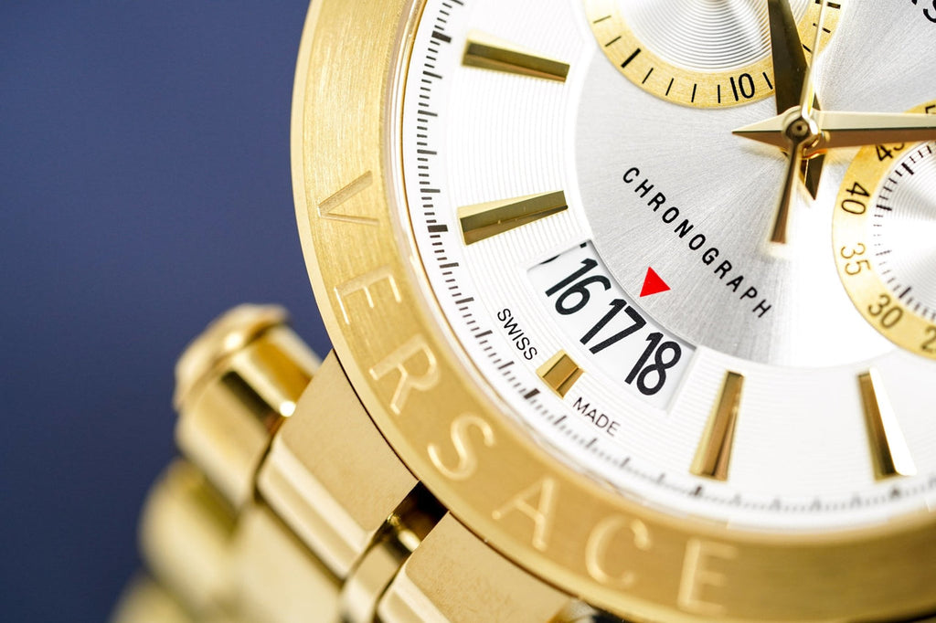 Experience luxury and style with the Versace V Racer Chronograph Watch. Featuring a chic white dial and gold steel strap, this watch is a must-have for any modern man. Its precise chronograph function and sleek design make it the perfect accessory for any occasion. Elevate your look with this stunning timepiece