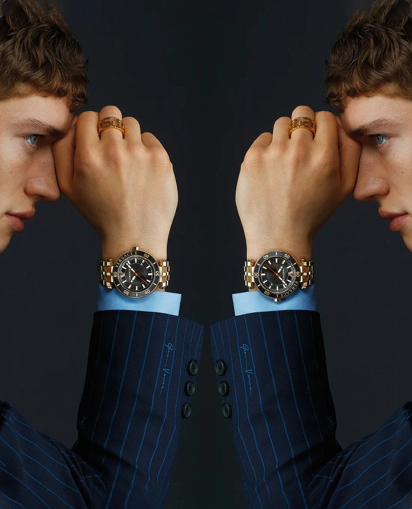 True to Versace tradition, every new sports racing model carries spirit and design inspiration from the past. The Greca Sport collection, is the undeniable definition of this model and pure expression of the Versace sport racing soul. The prominent minute-track style alongside the micro-perforations that emphasize the presence of the Greek Key, compliment this collection’s distinct and unique masculine form.