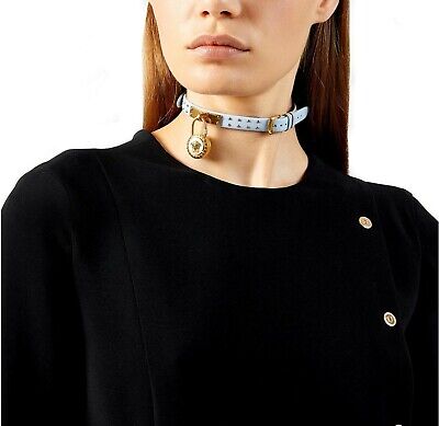 Gold-tone stainless steel case attached to a light blue leather strap set with icon studs. Fixed (greca pattern) gold-tone bezel. Gold dial with gold-tone hands. Dot markers at the 3, 6, 9 and 12 o'clock positions. Dial Type: Analog. Quartz movement. Scratch resistant sapphire crystal. Pull / push crown. Solid case back. Round case shape. Case size: 21.5 mm. Case thickness: 8 mm. Tang clasp. Water resistant at 30 meters / 100 feet. Functions: hour, minute. Medusa Lock Icon Series. Dress watch style. Watch label: Swiss Made. Versace Medusa Lock Icon Quartz Gold Dial Ladies Watch VEDW00419.