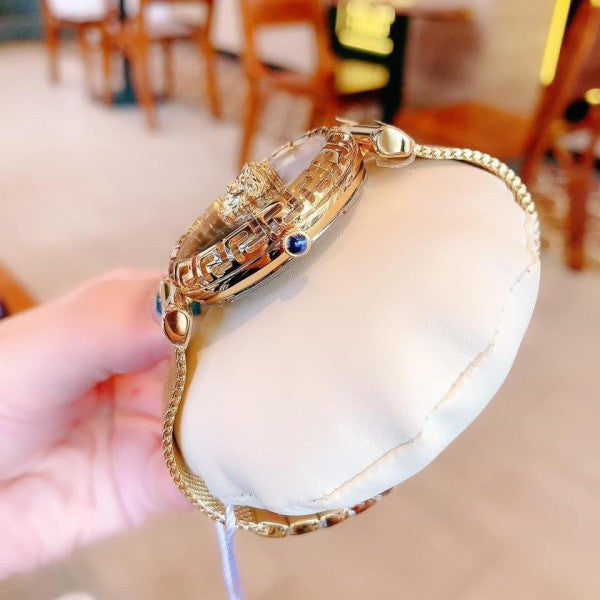 Gold IP stainless steel case with a gold IP stainless steel mesh bracelet. Fixed (greca pattern) gold IP stainless steel bezel. Black dial with gold-tone hands. No markers. Dial Type: Analog. Quartz movement. Scratch resistant sapphire crystal. Pull / push crown. Solid case back. Round case shape, case size: 37 mm. Band width: 16 mm. Butterfly clasp. Water resistant at 50 meters / 165 feet. Functions: hour, minute. Palazzo Empire Greca Series. Dress watch style. Watch label: Swiss Made. Versace Palazzo Empire Greca Quartz Black Dial Ladies Watch VEDV00519.