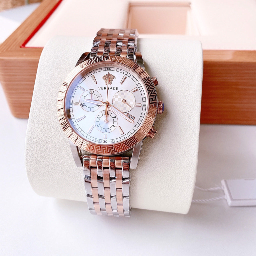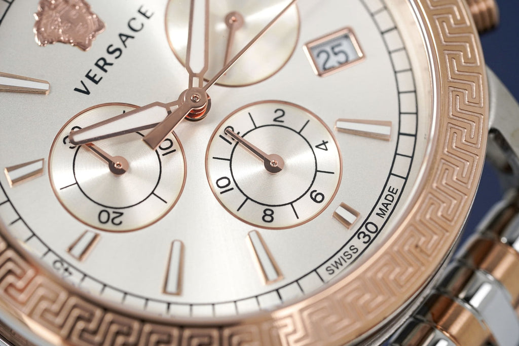 Stainless steel case with a two-tone (silver-tone and rose gold ion-plated) stainless steel bracelet. Fixed rose gold ion-plated bezel. Silver dial with luminous rose gold-tone hands and index hour markers. Minute markers around the outer rim. The Medusa Head logo appears at the 12 o'clock position. Dial Type: Analog. Luminescent hands and markers. Date display at the 4 o'clock position. Chronograph - three sub-dials displaying: 60 second, 30 minute and 12 hour. Ronda caliber 5030.D quartz movement. Scratch resistant sapphire crystal. Pull / push crown. Solid case back. Round case shape. Case size: 40 mm. Case thickness: 10 mm. Band width: 17.5 mm. Deployment clasp. Water resistant at 50 meters / 165 feet. Functions: chronograph, date, hour, minute, second. Sport Tech Series. Sport watch style. Watch label: Swiss Made.