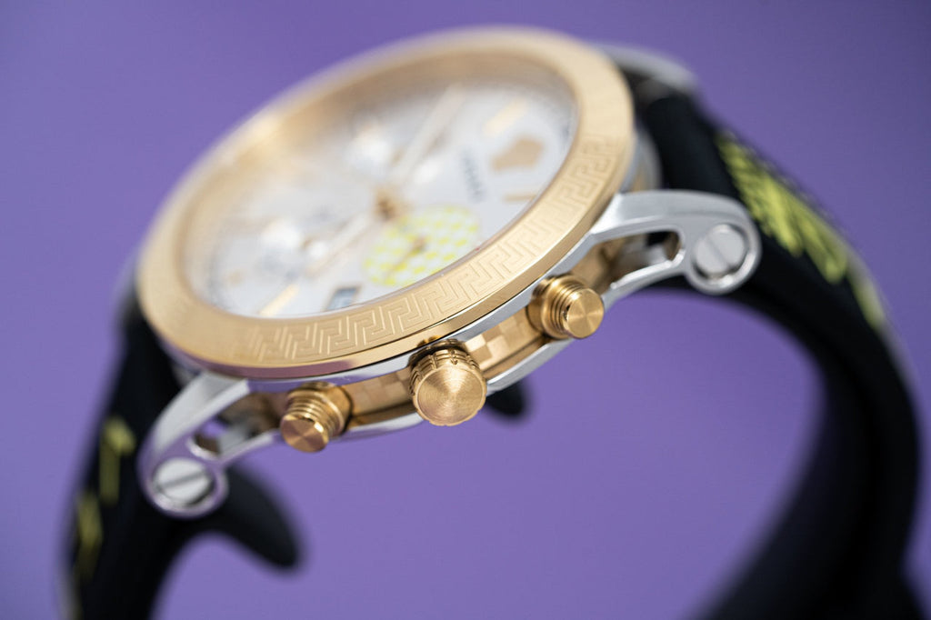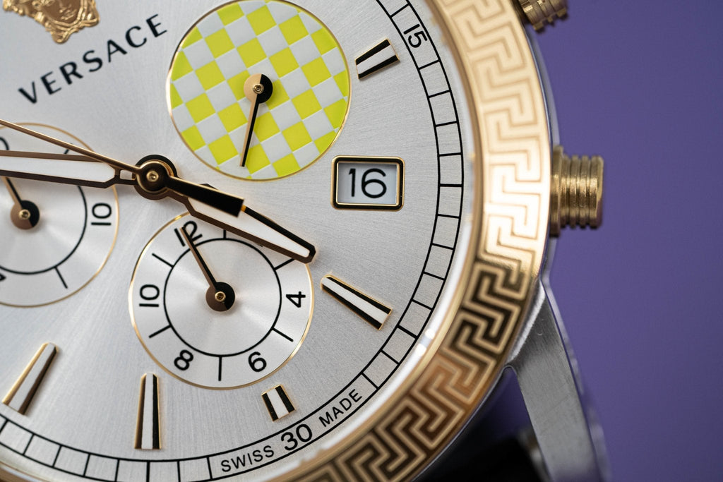 Silver Sunray Dial. Gold Plated Hour Markers, Luminous Hands. IP Gold Sub-Dials with a 12 Hour counter at 6 O'Clock, 30 Minute Counter at 9 O'Clock and Green Small Seconds at 3 O'Clock. Date Window at 4 O'Clock. IP Gold Medusa Head at 12 O'Clock