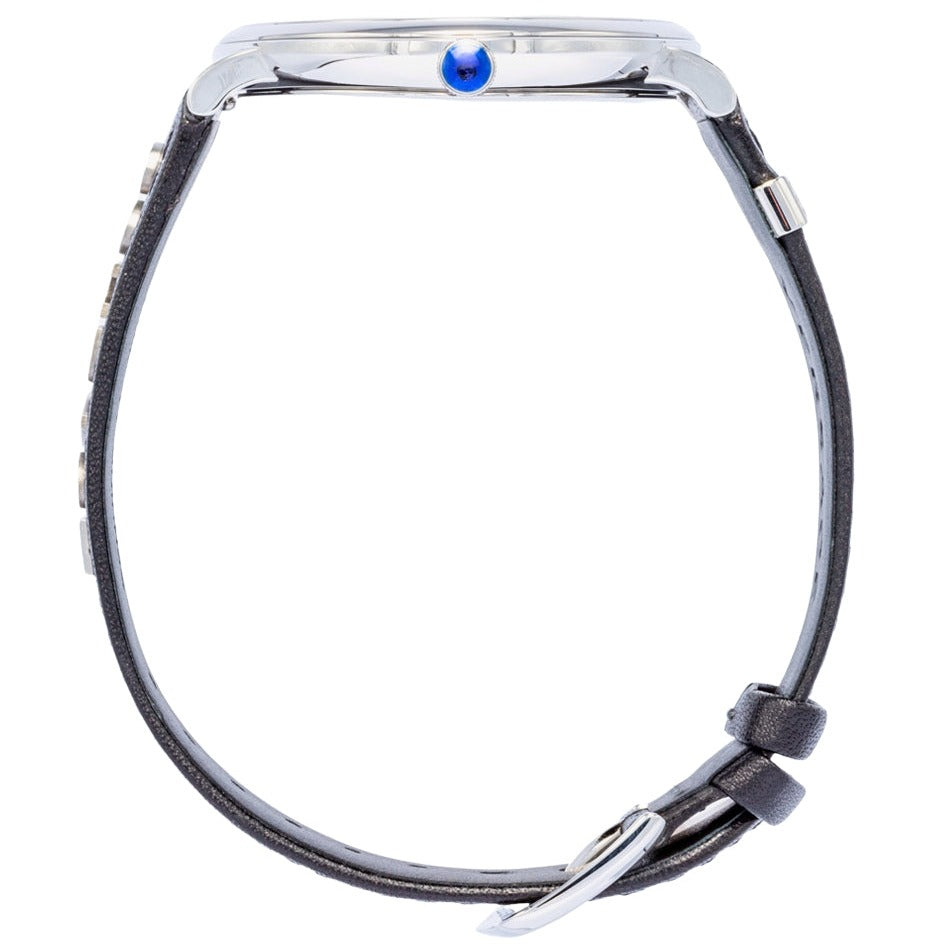 Stainless steel case with a black leather strap. Fixed stainless steel bezel. Silver dial with luminous silver-tone hands and index hour markers. Dial Type: Analog. Luminescent hands. Date display above the 6 o'clock position. Small second sub-dial. Quartz movement. Scratch resistant sapphire crystal. Pull / push crown. Solid case back. Round case shape. Case size: 42 mm. Case thickness: 10 mm. Band width: 20 mm. Tang clasp.