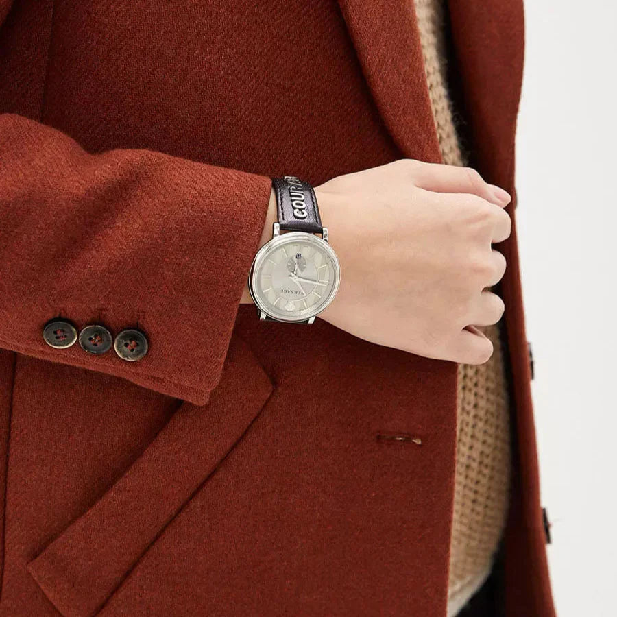 Versace V-Circle Black Manifesto Courage Quartz Silver Dial Black Leather Strap Watch for Men - VBQ080017