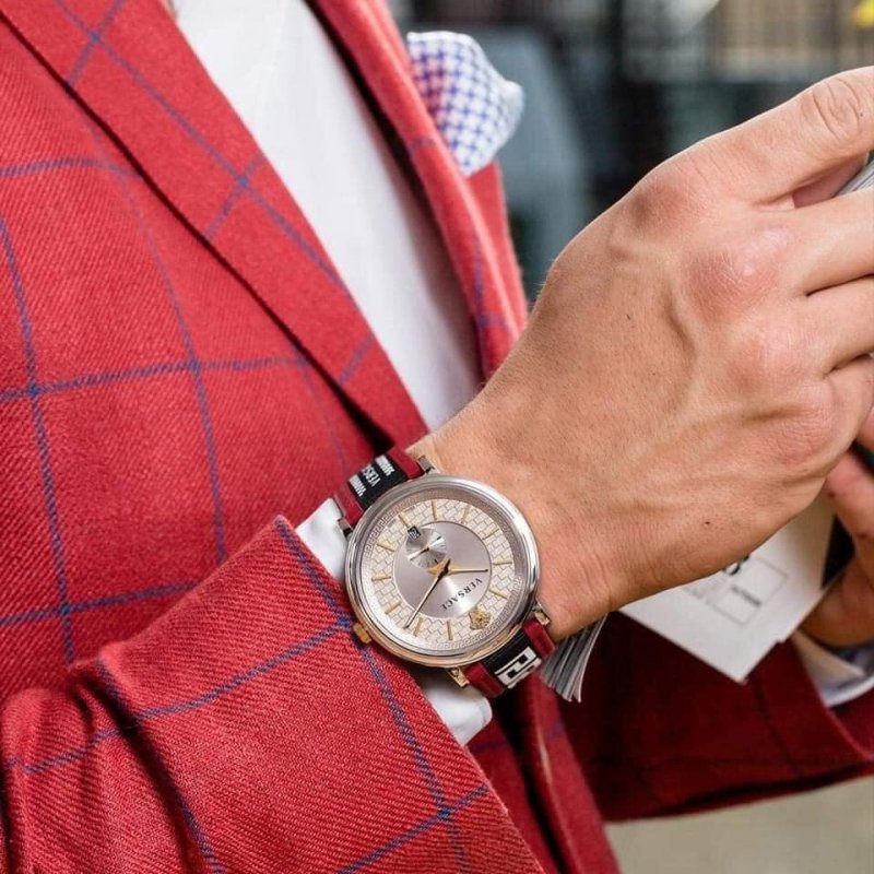 Versace men's watch from the V-Circle collection. The movement of the watch is Swiss Made quartz with date function. The 42 mm diameter case is made of steel. The strap is made of red leather. The dial is silver in color. The glass of the watch is scratch-resistant and anti-reflective sapphire. Water resistance is 5 atm / 50 meters. Reference: VEBQ01319