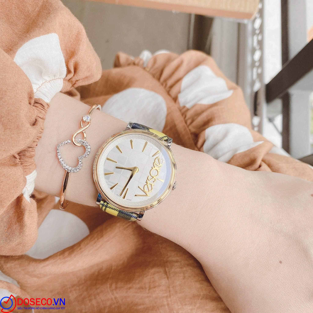 38mm – Two tone SS/ IP 1N, IPYG 1N round case. Vintage logo Versace on the dial and tartan leather strap