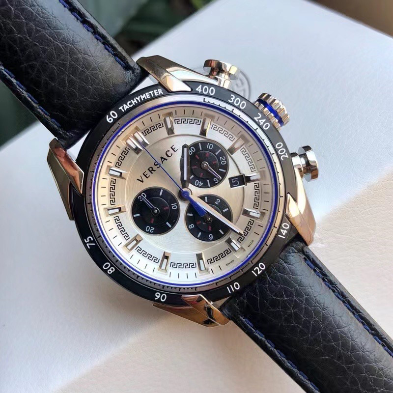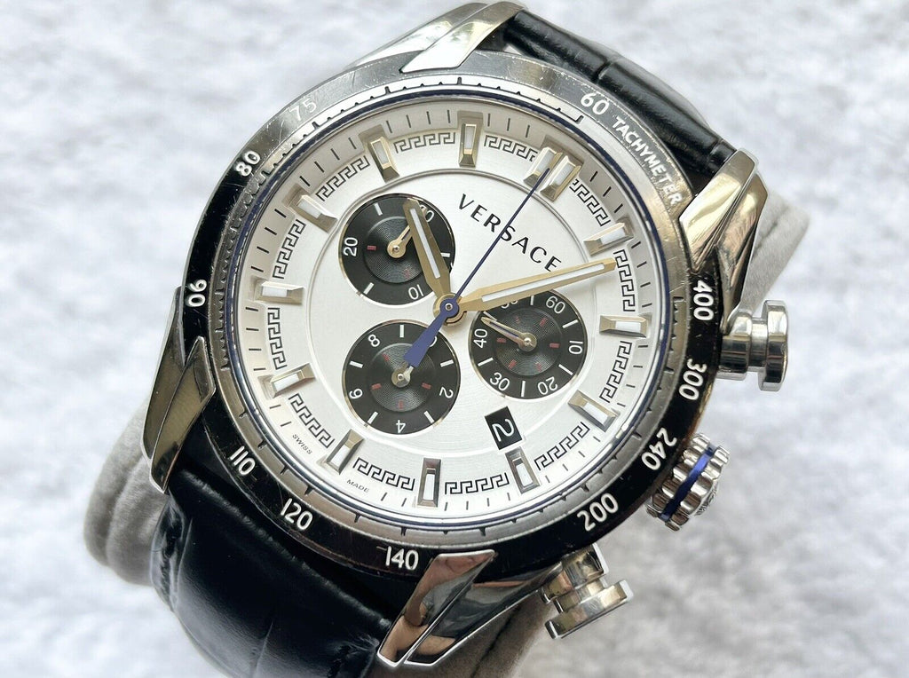 - Watch featuring round white dial with Greca-patterned border, date window, and contrast chronograph subdials