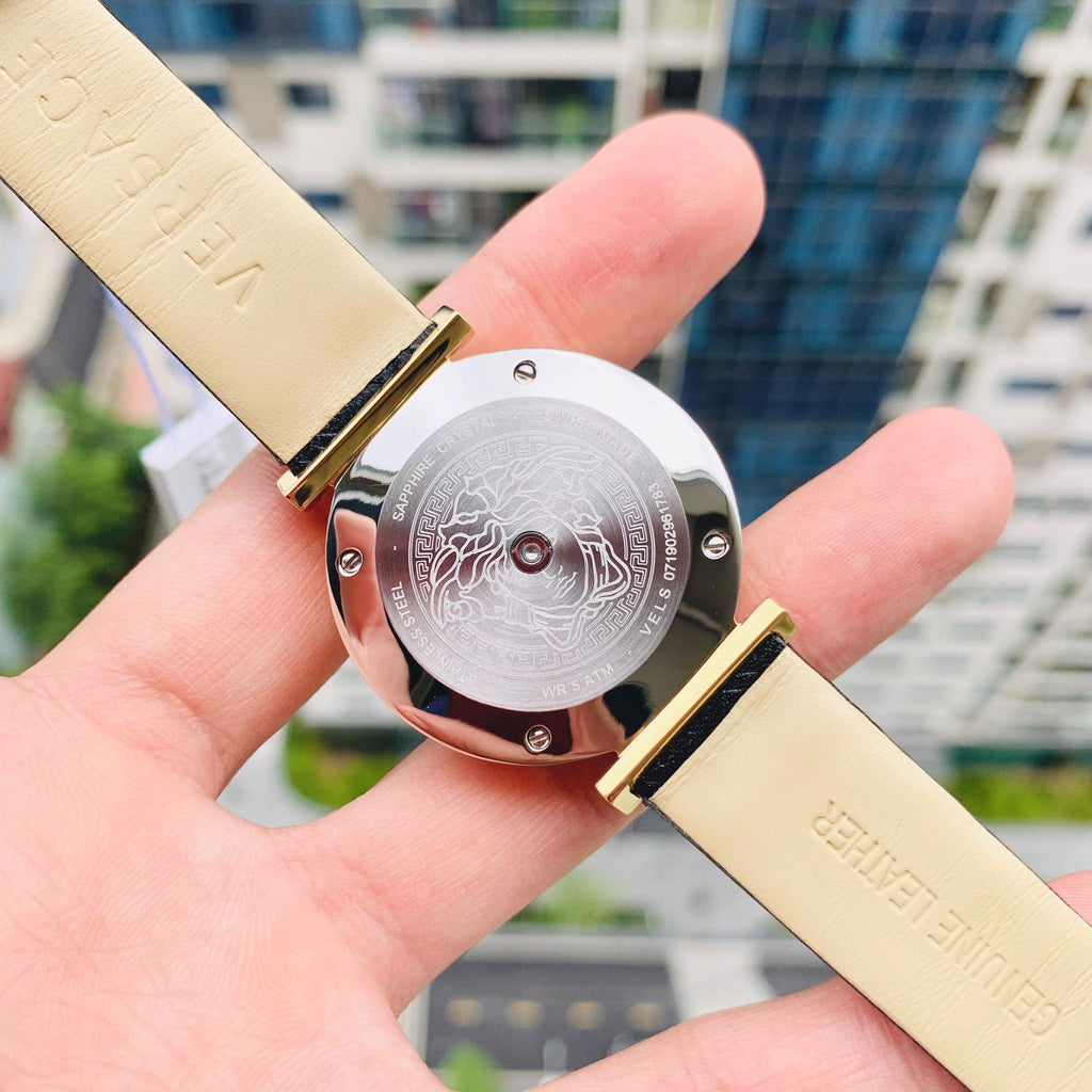 Yellow gold-tone stainless steel case with a black leather strap. Fixed yellow gold-tone bezel. Black dial with gold-tone hands and index hour markers. The Medusa Head logo appears at the 12 o'clock position. Dial Type: Analog. Quartz movement. Scratch resistant sapphire crystal. Pull / push crown. Solid case back. Round case shape. Case size: 36 mm. Band width: 18 mm. Deployment clasp. Water resistant at 50 meters / 165 feet. Functions: hour, minute. V-twist Series. Dress watch style. Watch label: Swiss Made. Versace V-Twist Quartz Black Dial Ladies Watch VELS00619.