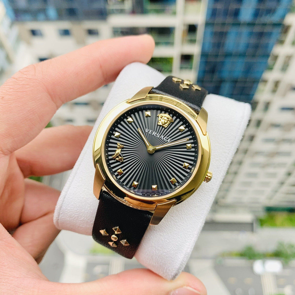 Dial Type: Analog. Quartz movement. Scratch resistant sapphire crystal. Pull / push crown. Solid case back. Round case shape. Case size: 38 mm. Case thickness: 8 mm. Band width: 18 mm. Fold over clasp. Water resistant at 30 meters / 100 feet. Functions: hour, minute. Dress watch style. Watch label: Swiss Made. Versace Audrey Quartz Black Dial Ladies Watch VELR00319.