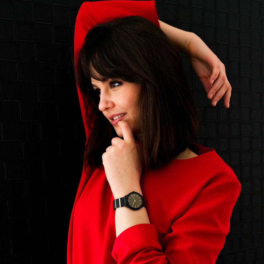 - Sleek black dial with a minimalist design