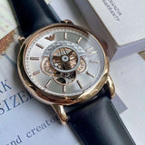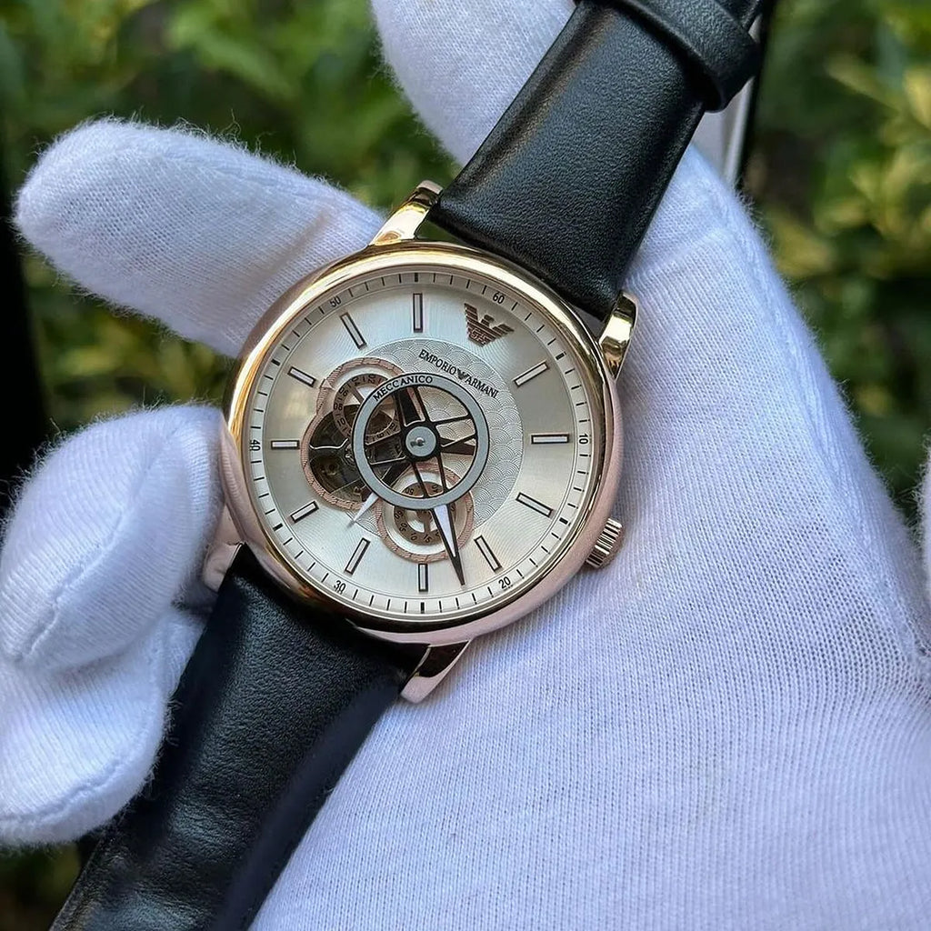 Silver (Skeleton Window) dial enhanced by luminous rose gold-tone hands. Rose Gold-tone stainless steel case with a black leather band. Automatic movement. 50 meters / 165 feet water resistance. Fixed bezel. Scratch Resistant Mineral crystal. Transparent caseback. Tang clasp. Pull / Push crown. Case size 43 mm x 12 mm. Band 20 mm x long. Emporio Armani AR60013 Luigi Watch.
