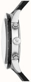 This stylish piece features a black chronograph dial with silver coloured indexes. The watch is finished with a black leather strap and a traditional buckle fastening.