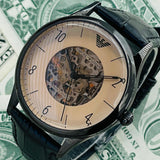 A clear window into the mechanical gears gives an art deco-inspired touch to this emporio Armani dress watch. The matte black leather strap adds bold sophistication.