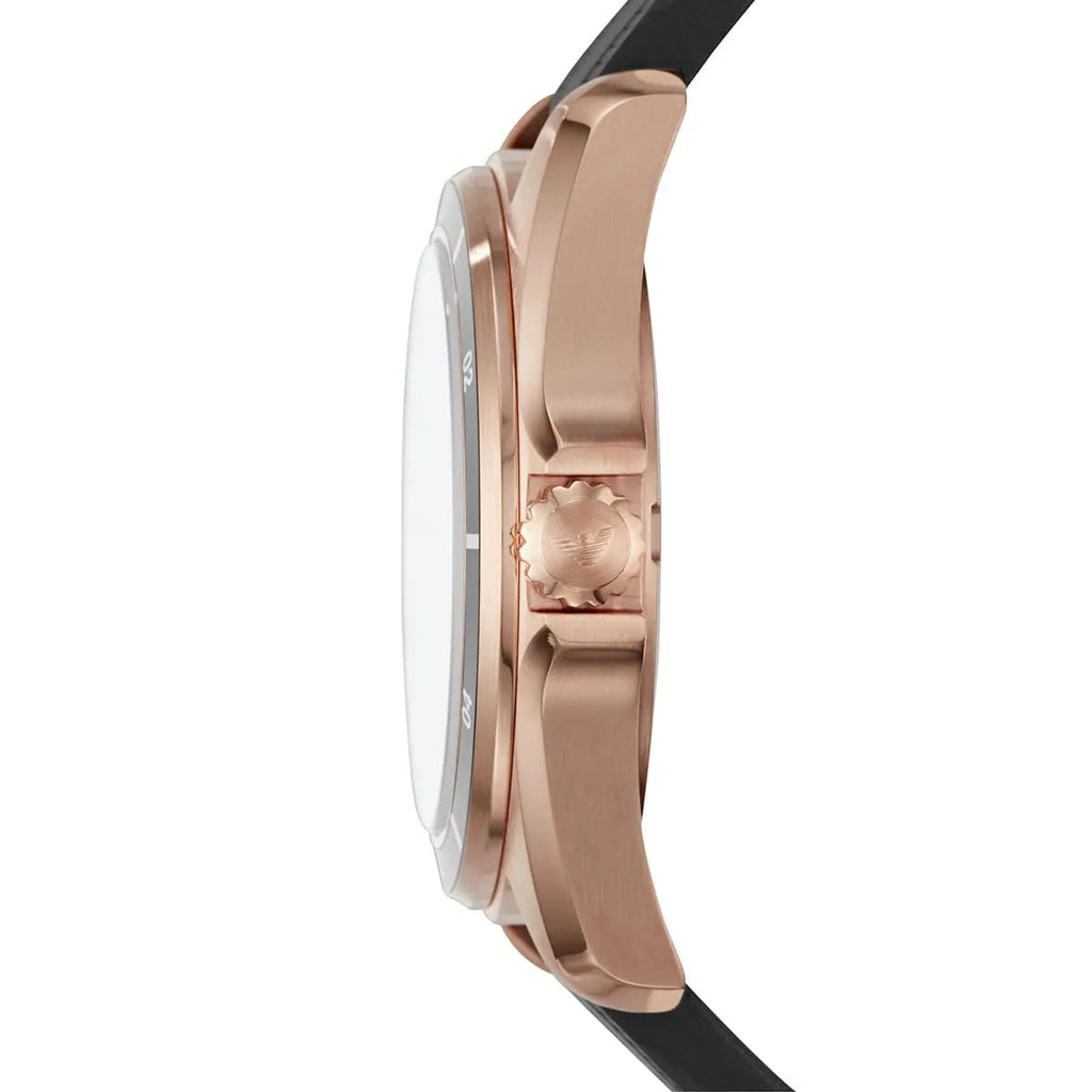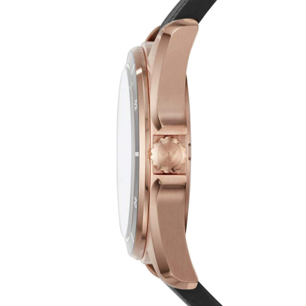 This Dynamic styling drives the versatile look of this Emporio Armani watch. This watch is fastened with a black and branded rubber strap and features a 44mm rose gold-tone stainless steel case with a black bezel. The round face displays a black textured dial that's enhanced by rose golden baton hour markers, rose golden hands, and a date window at 6 o'clock. This watch is powered by a quartz movement.