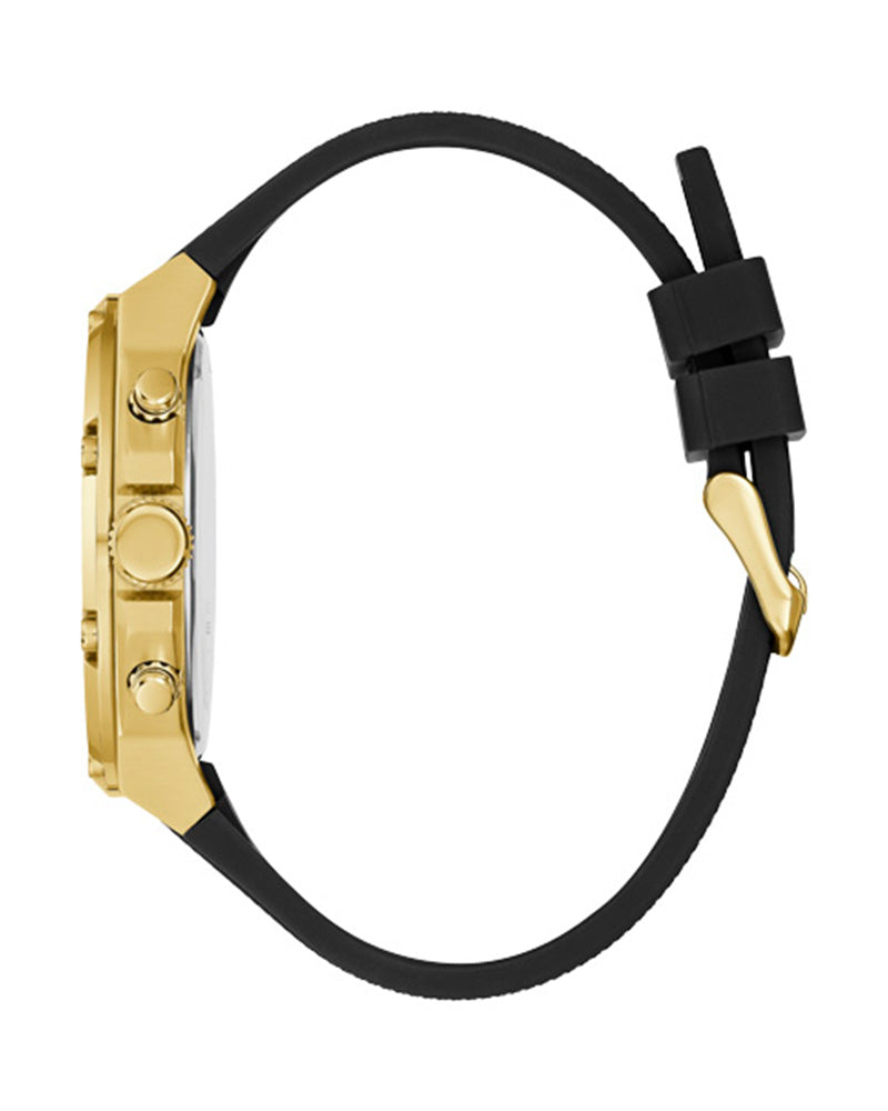 Step out in style everyday with this unique and classy Guess GW0334G2 Third Gear Unisex Watch. The black and gold design is especially chic, with its silicone watch strap that is comfortable to wear. The dial is unlike any other, with the smooth finish of stunning yellow gold and the intricate details of chronograph. Guess watches are a staple in any wardrobe, they can be dressed up or down with ease and are a piece that is sure to turn heads. Fine details in the design really make this piece stand out with an almost mechanical feel.