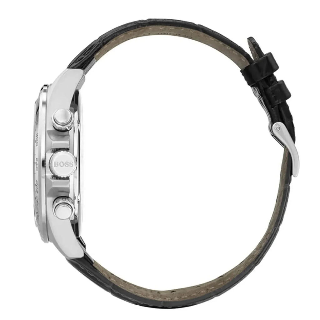 This Hugo Boss watch has a stainless steel case 45mm in diameter and is fitted with a leather strap. Inside the case lies a movement and the watch features a mineral crystal. Black dial color, strap color black with silver case, buckle clasp. Water resistance upto 50 meters.