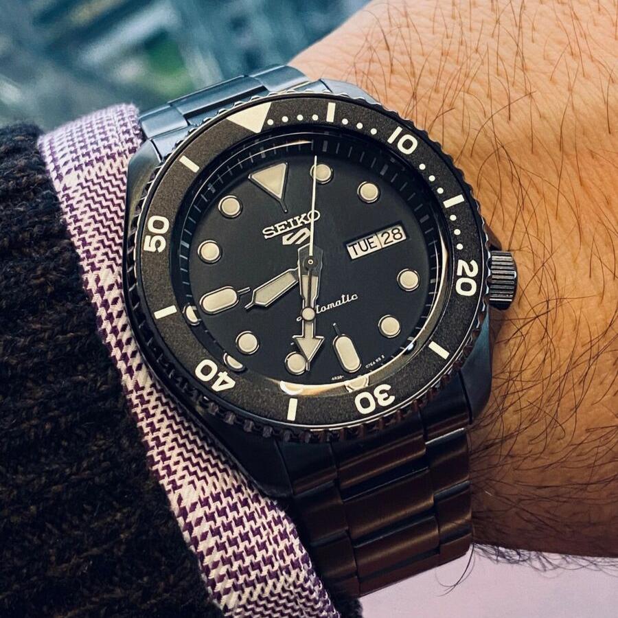 This Seiko 5 Sports Series timepiece features Automatic movement housed within a Stainless Steel casing and black dial with white details. Its strap is also crafted from Stainless Steel, providing a durable design with a case size of 42.5 mm. The watch is submergible up to 10 BAR.