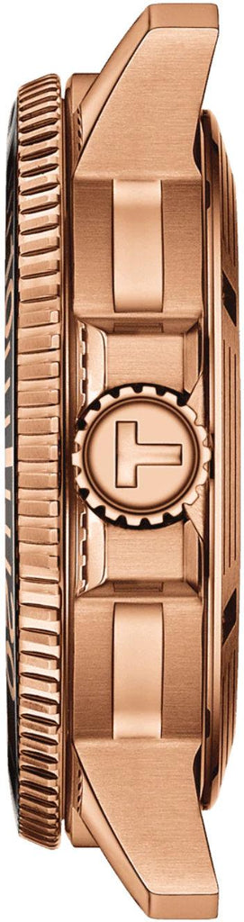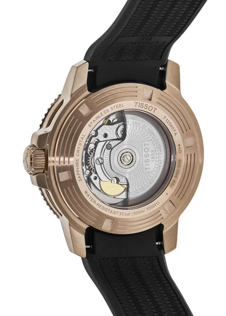 Brand New Authentic Tissot Seastar 1000 Black Dial Black Rubber Strap Men's Watch Model T120.407.37.051.01. Stainless Steel with Rose Gold PVD coating case with Black Rubber strap. Tang clasp. Dial description: Rose Gold tone hands and Dot/Index hour markers with minute markers around the outer rim on a Black dial. Automatic movement. Powered by Tissot Caliber Powermatic 80.111 engine with 80 hours power reserve.