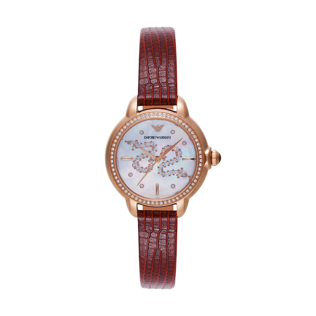 Emporio Armani's 32mm watch features a white mother-of-pearl dial with a snake motif in crystal stones, three-hand movement, and a red lizard texture leather strap.