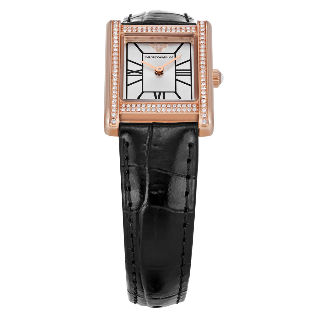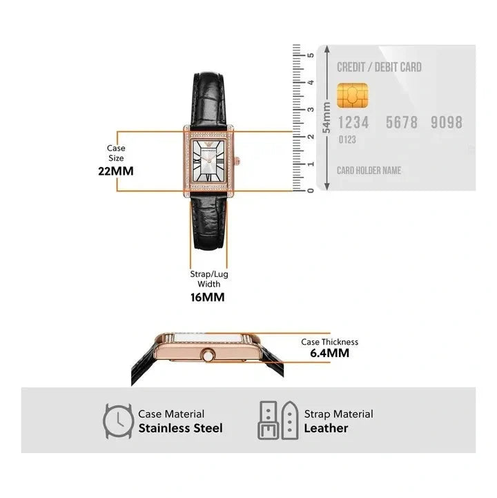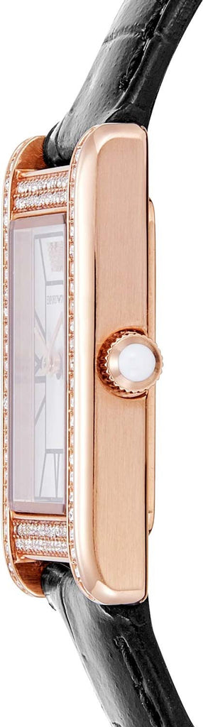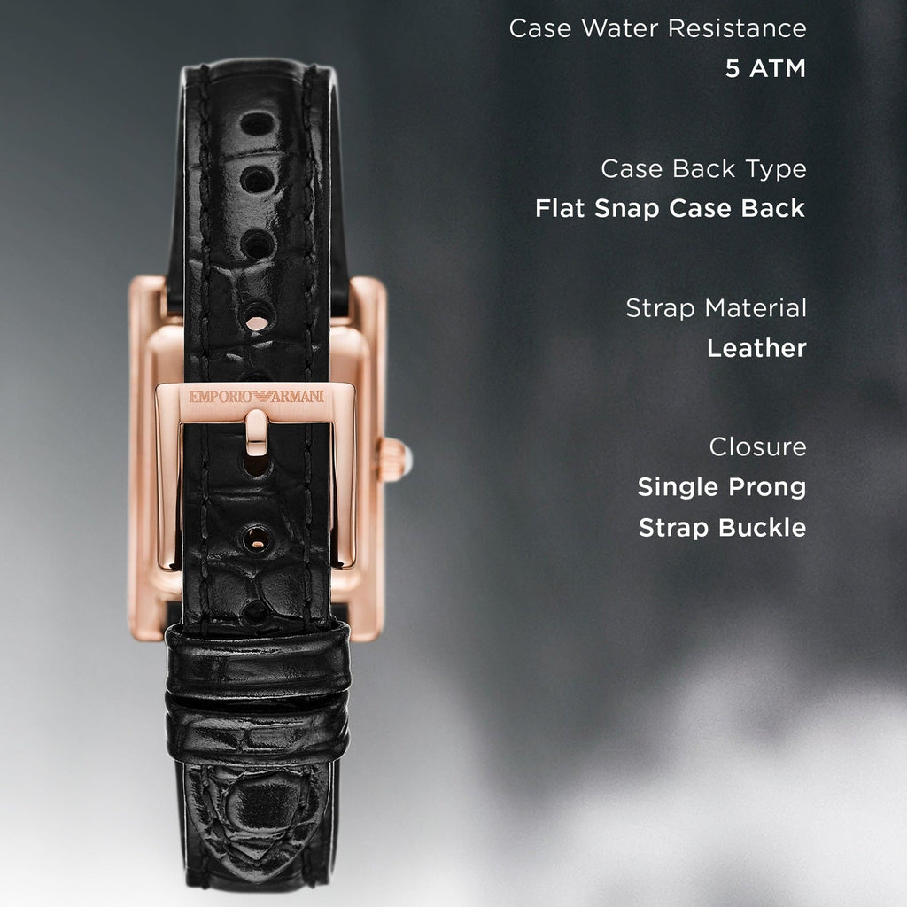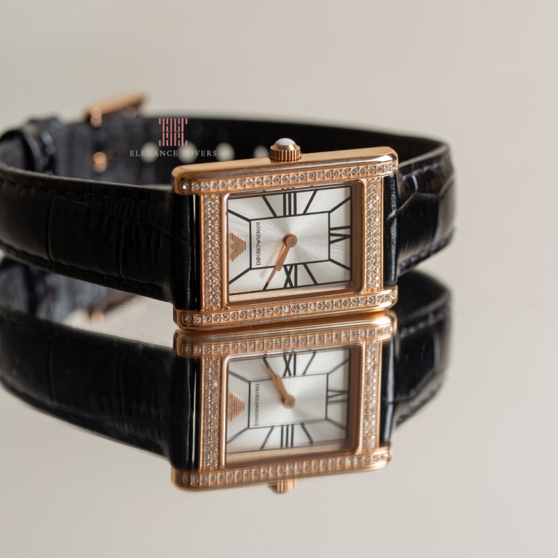 This Emporio Armani women’s watch pairs refined Italian craftsmanship with a minimalist sensibility, making it a standout in the luxury watches category. The rectangular 22 mm rose gold stainless steel case is accented with delicate crystal detailing, framing a silver sunray dial with bold Roman numerals and a signature logo at 12 o’clock. Powered by a reliable quartz two-hand movement, it offers both precision and understated elegance. The black leather strap, embossed with a crocodile texture and finished with fine stitching, adds timeless appeal while ensuring comfort and durability. With 5 ATM water resistance and a mineral crystal glass, this timepiece blends graceful design with everyday functionality.