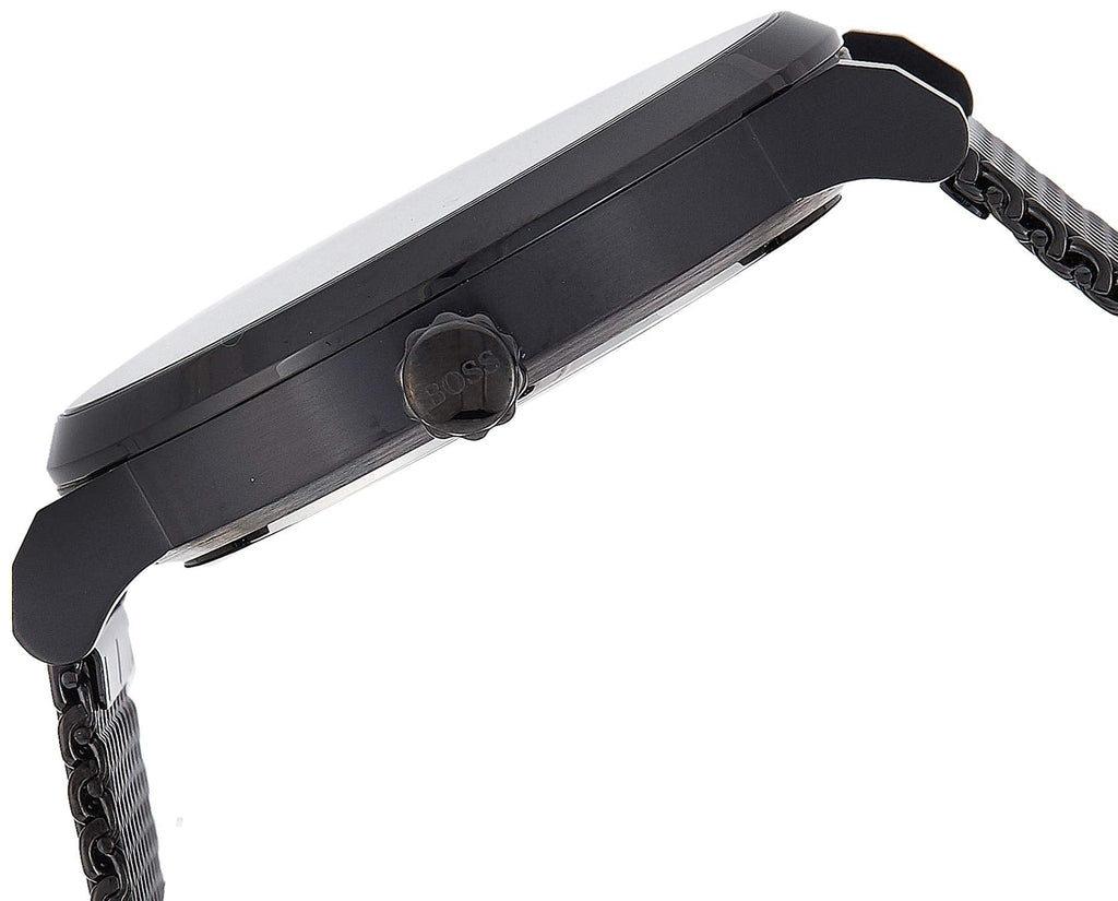 A masculine three-hand watch by BOSS, crafted in black-plated stainless steel with a coordinating mesh bracelet. This refined timepiece features a minimalistic design with a slimline bezel, applied and faceted indexes, and overlapping chronographs delivering a taste of modernity to a staple accessory. Add this watch to your collection for clean and contemporary BOSS style.