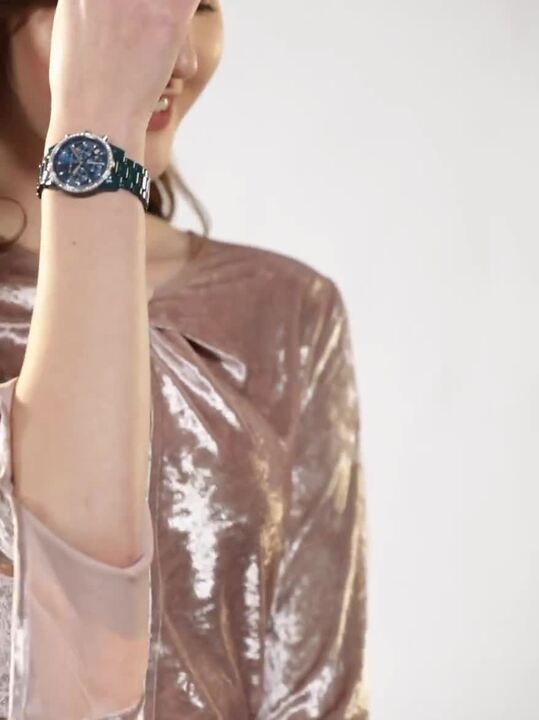 Teal-tone stainless steel case and bracelet. Fixed stainless steel bezel set with crystals. Blue dial with silver-tone hands and crystal-tipped index hour markers. Minute markers around the outer rim. Dial Type: Analog. Date display between the4 and 5 o'clock positions. Chronograph - three sub-dials displaying: 60 second, 30 minute and 12 hour. Quartz movement. Scratch resistant mineral crystal.