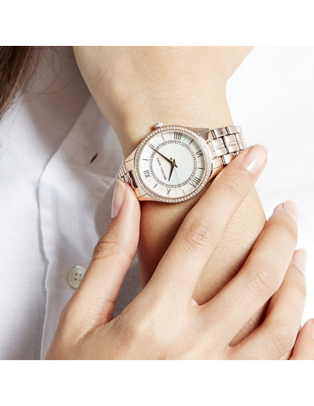 Rose gold-tone stainless steel case with a rose gold-tone stainless steel bracelet set with crystals. Fixed rose gold-tone bezel set with crystals. White mother of pearl (crystal-set) dial with rose gold-tone hands and alternating Roman numeral and index hour markers. Dial Type: Analog.