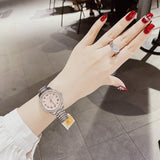 Classic and chic. This is a stainless steel and other function watch with a case diameter of 34 mm. The light pink dial features Roman numerals, and the top ring and bracelet are accented with pavé. This watch has an exquisite shine.