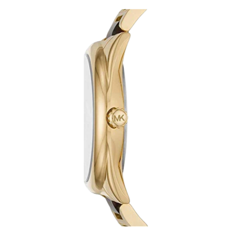 Michael Kors Janelle 42mm watch features a gold-tone dial with a tort logo, three-hand movement and gold-tone bracelet with tort acetate center links.
