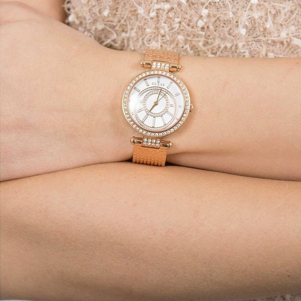 Guess Muse Quartz Silver Dial Rose Gold Steel Strap Watch For Women - W1008L3