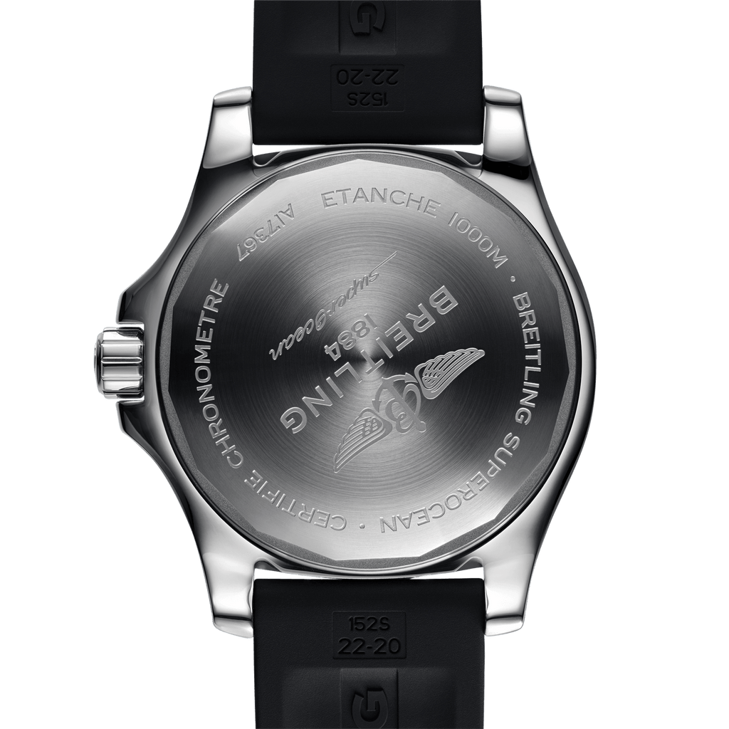 The dream diving watch for today’s modern diver, this Breitling Superocean Automatic watch combines a sporty yet sophisticated finish that transitions between ocean escapades and desk duties effortlessly. It’s striking ocean black dial and black rubber strap provide an aesthetic for adventure while its robust 44mm stainless steel case is water resistant to 1,000 metres with a specially engineered security valve to equalize the differences in pressure between the interior and exterior of the case.Hidden within the heart of this Breitling Superocean watch is the remarkable Breitling 17 self-winding mechanical calibre. This impressive movement is chronometer certified to be accurate to -4 to +6 seconds a day and equips the Breitling diving watch with large Superluminova coated hour and minute hands, a large red-tipped arrow shaped seconds hand, a date window at 3 o clock and a power reserve of 38 hours. The combination of the luminous dial elements, ratcheted unidirectional turning divers bezel and anti-reflective sapphire crystal glass makes it the men’s Breitling watch of choice for endurance, elegance and easy legibility.