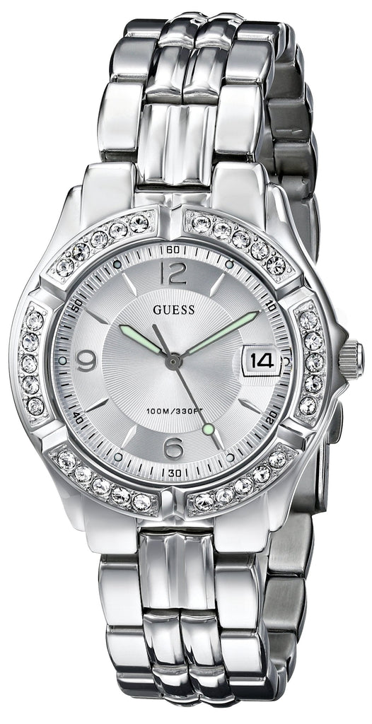 Stainless steel case with a stainless steel bracelet. Fixed silver-tone bezel set with Swarovski crystals. Silver textured dial with luminous hands and index hour markers. Arabic numerals mark the 6, 9, and 12 o'clock positions. Minute markers around the outer rim. Date display appears at the 3 o'clock position. Quartz movement. Scratch resistant mineral crystal. Solid case back. Case diameter: 37 mm. Push button deployment clasp. Water resistant at 100 meters /330 feet. Functions: hours, minutes, seconds, calendar. Guess Water Pro Womens Watch G75511M.