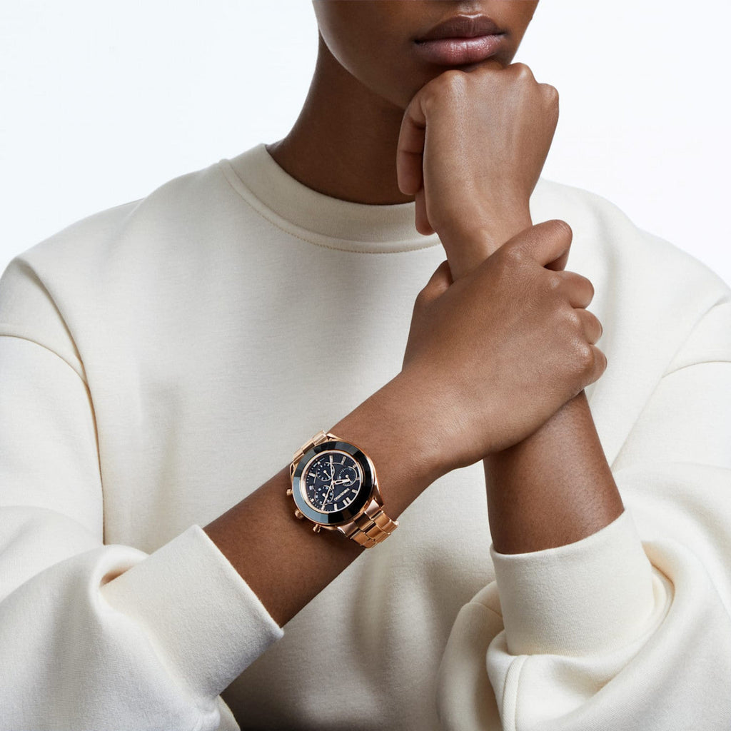 Women's chronograph watch from Swarovski from the octea lux sport collection. Octea lux sport watch, metal bracelet, black, pvd rose gold case size: 39 mm, watch strap length: 16. 5 cm. With the impeccable style of the octea lux sport 39 mm chronograph you can live to the fullest every second of every day. In stainless steel with pvd coating in rose gold tone, it features a striking black dial with sunray pattern, crystal indexes, three counters and a dater. The innovative and luxurious crystal bezel, made exclusively for this line and an elegant metal bracelet with three links, complete an extraordinary design, a demonstration of art and craftsmanship. The swiss made watch is water resistant up to 50 m