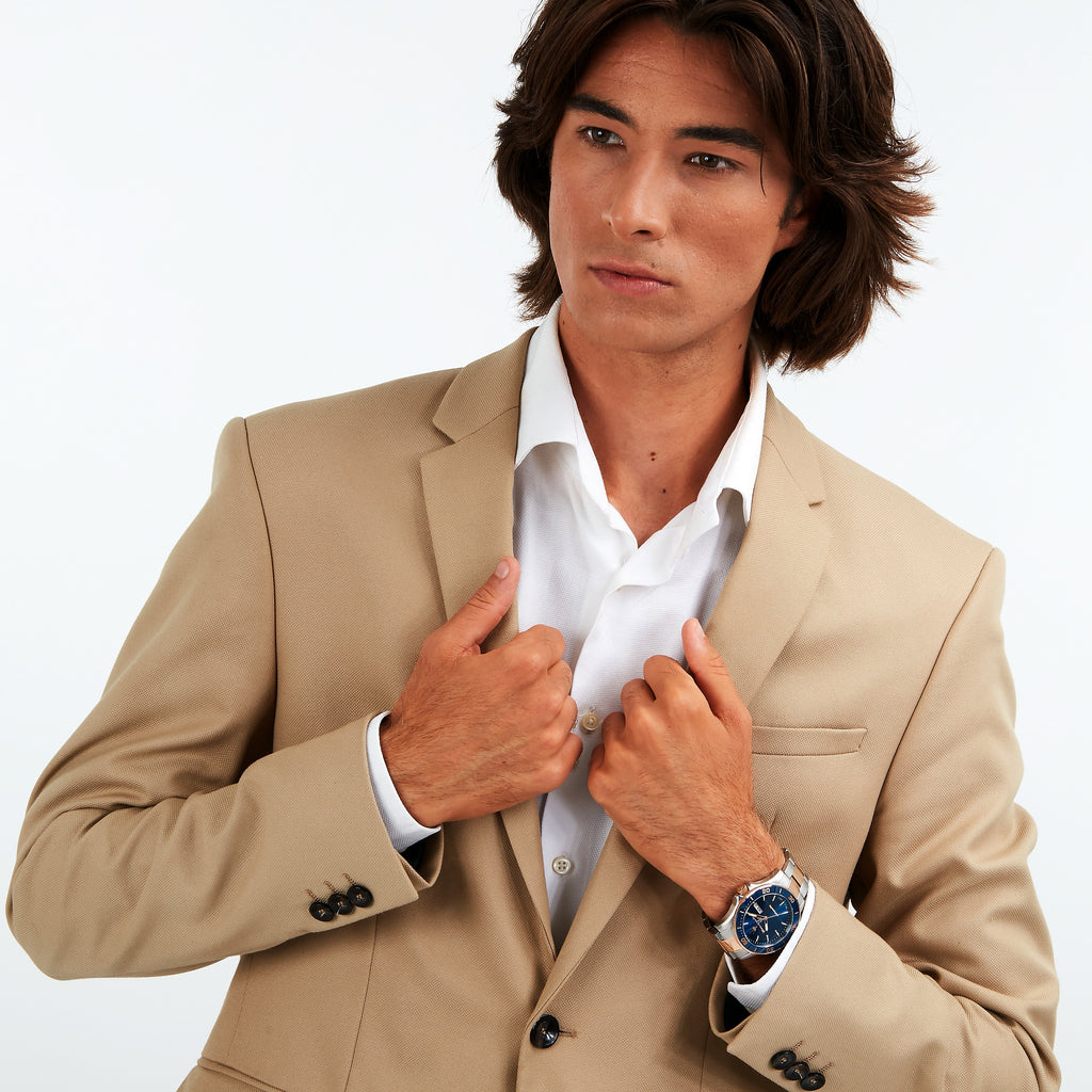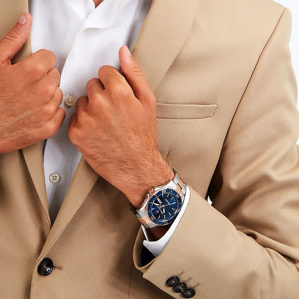 The blue dial is complemented by a day-of-the-month and day-of-the-week date, as well as luminescent-coated indexes and hands. The model features a rotating ceramic bezel, a screw-down crown and a screw-down transparent caseback. The water resistance of the watch is 10 ATM. The envelope and bracelet are made of stainless steel in silver-pink gold.