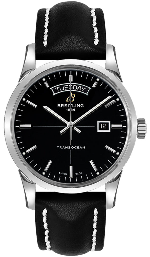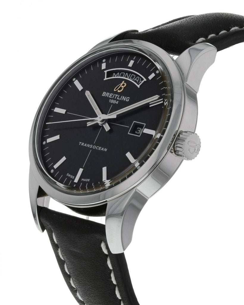 Stainless steel case with a black leather strap. Fixed stainless steel bezel. Black dial with luminous silver-tone hands and index hour markers. Minute markers around the outer rim. Dial Type: Analog. Luminescent hands and markers. Date display at the 3 o'clock position. Day of the week display at the 12 o'clock position. Automatic movement with a 42 hour power reserve. Scratch resistant sapphire crystal. Pull / push crown. Solid case back. Case diameter: 43 mm. Case thickness: 12.8 mm. Round case shape. Band width: 22 mm / 20 mm. Deployment clasp. Water resistant at 100 meters / 330 feet. Functions: date, day, hour, minute, second. Luxury watch style. Watch label: Swiss Made. Item Variations: Breitling TransOcean Day Date Automatic Black Dial Black Leather Men's Watch A4531012