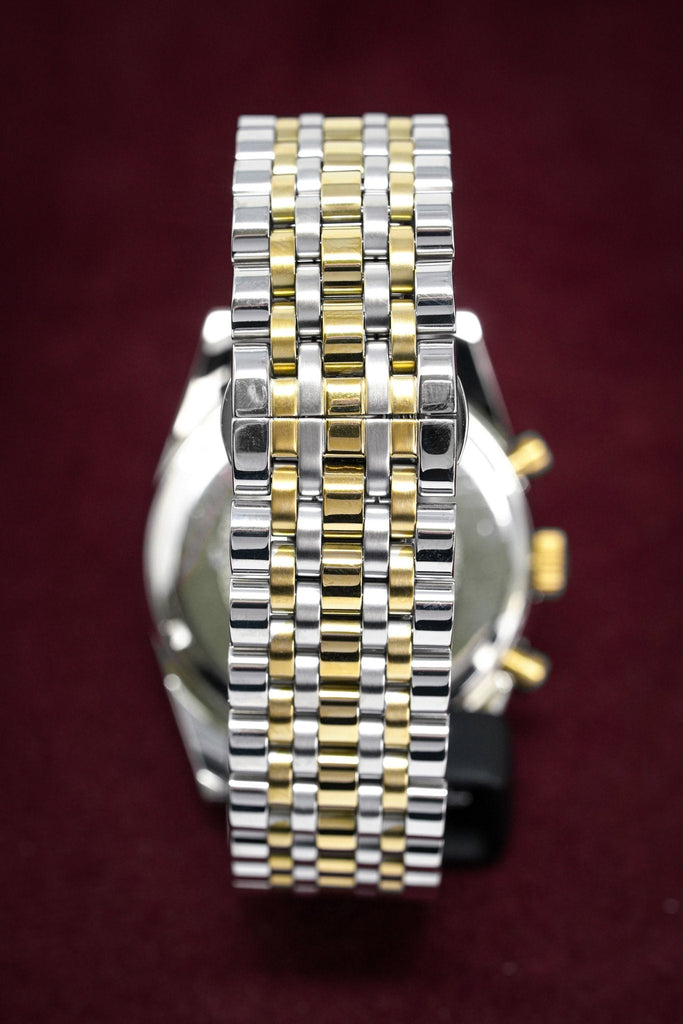 46mm x 13mm Stainless Steel Case. Solid Caseback. Blue Tachymeter Bezel. Gold PVD Plated Steel Pushers and Crown.