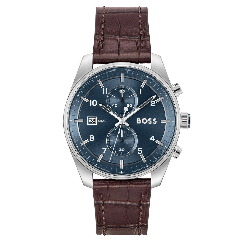 Hugo Boss Skytraveller Chronograph Blue Dial Brown Leather Strap Watch for Men - 1514194