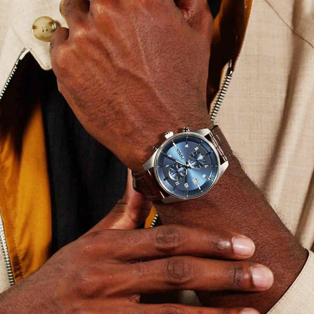 The Hugo Boss Skytraveller Chronograph combines sophisticated style with practical functionality. Featuring a striking blue dial that captures attention, this timepiece is anchored by a rich brown leather strap that exudes timeless elegance. The chronograph complication adds versatility for timing precision, whether you're tracking workouts or managing your day. Built with Hugo Boss's commitment to quality craftsmanship, this watch seamlessly transitions from boardroom to weekend adventures. Perfect for the modern man who refuses to compromise between style and substance.