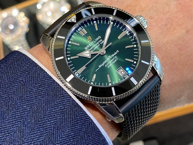 Featuring the iconic triangular-shaped hands as well as a unidirectional bezel with a polished ceramic ring, the Superocean Heritage is an elegant looking diver’s watch. Available in a variety of sizes and materials including stainless steel and 18k red gold, the Superocean Heritage B20 Automatic features a range of black, blue or green dials. Offered either with a matching mesh bracelet, or a “mesh-styled” rubber strap fitting a folding buckle, this Superocean Heritage is powered by the Breitling Manufacture Caliber B20, a COSC-certified chronometer based on the Tudor Caliber MT5612.