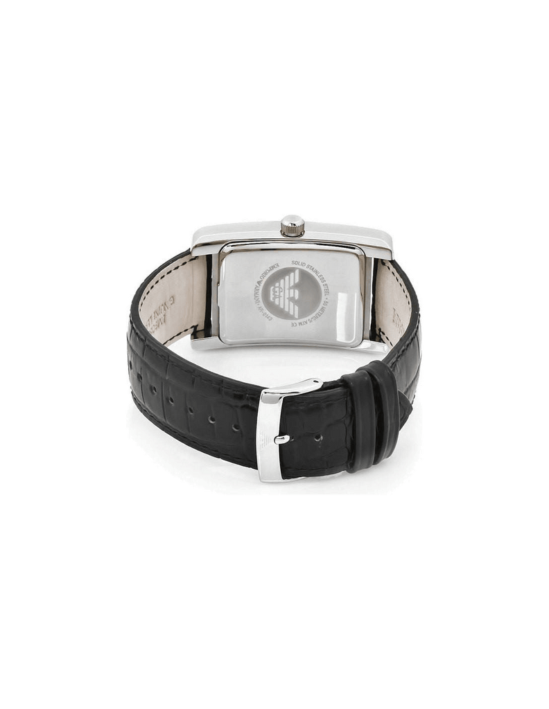 Stainless steel case with a black croco-embossed leather strap. Fixed stainless steel bezel. Black dial with silver-tone hands and Roman numeral hour markers. The Emporio Armani Eagle appears at the 12 o'clock position. Small seconds sub-dial above the 6 o'clock position. Quartz movement. Scratch resistant mineral crystal. Textured steel crown. Solid case back. Case dimensions: 34 mm x 38 mm. Case thickness: 7 mm. Tang clasp. Water resistant at 50 meters/ 165 feet. Functions: hours, minutes, small seconds. Emporio Armani Classic Black Leather Mens Watch AR0143.