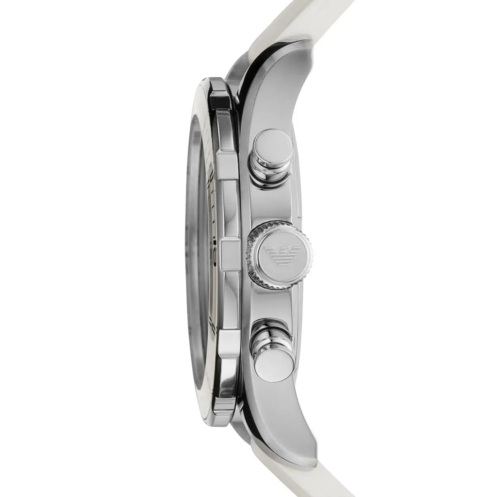 Enhance your style with the Emporio Armani Sportivo Chronograph Watch. This sleek timepiece features a white dial and a stylish design that is sure to turn heads. Keep track of time with its reliable chronograph function and elevate your look with a touch of luxury.