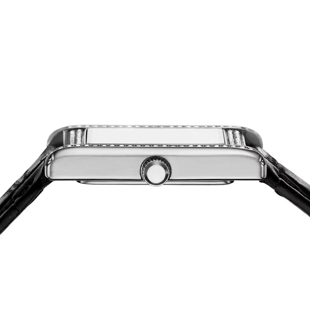 This 22mm x 32mm watch features a silver sunray dial, two-hand movement and black crocodile-patterned leather strap with stitching along the sides.