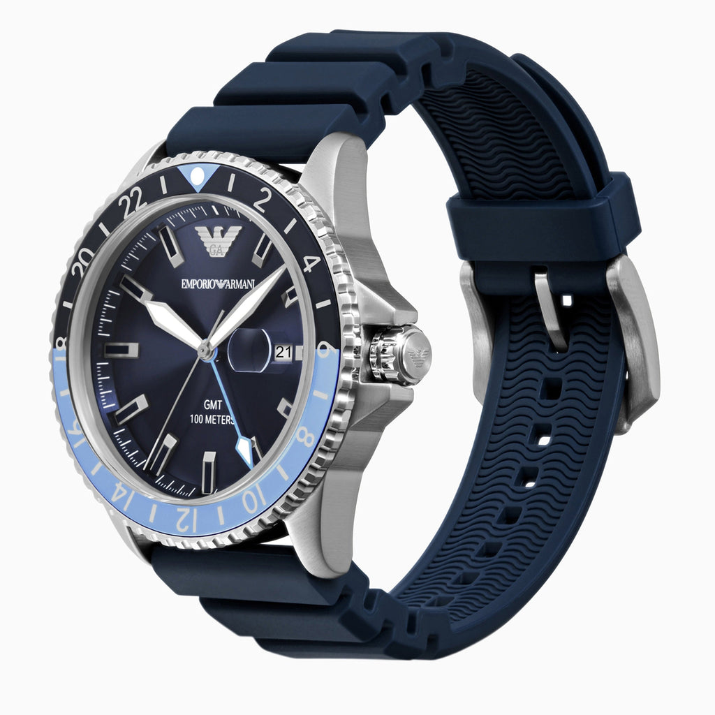 Discover timeless sophistication with the Emporio Armani World Explorer GMT. This striking timepiece features a captivating blue dial paired with a comfortable blue rubber strap, designed for the modern man who values both style and functionality. The GMT complication keeps you connected across time zones, making it an ideal companion for travelers and global professionals. Crafted with Emporio Armani's signature elegance, this watch seamlessly transitions from boardroom to weekend adventures. Elevate your wrist game with a timepiece that commands attention while delivering reliable performance day after day.