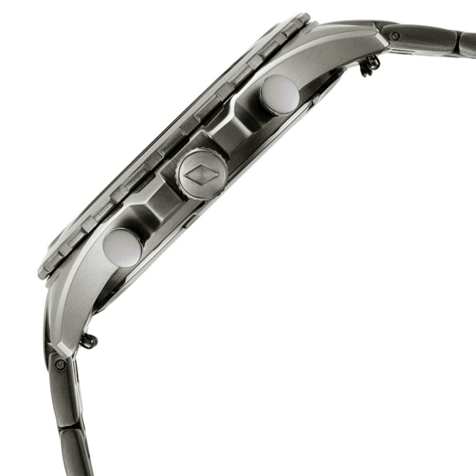 Smoke-plated stainless steel case and bracelet. Fixed smoke-plated bezel. Black dial with luminous grey hands and index hour markers. Arabic numerals appear at the 3, 6, 9 and 12 o'clock positions. Minute markers around the outer rim. Dial Type: Analog. Luminescent hands and markers. Date display between the 4 and 5 o'clock positions. Chronograph - three sub-dials displaying: 60 second, 30 minute and 24 hour. Quartz movement.