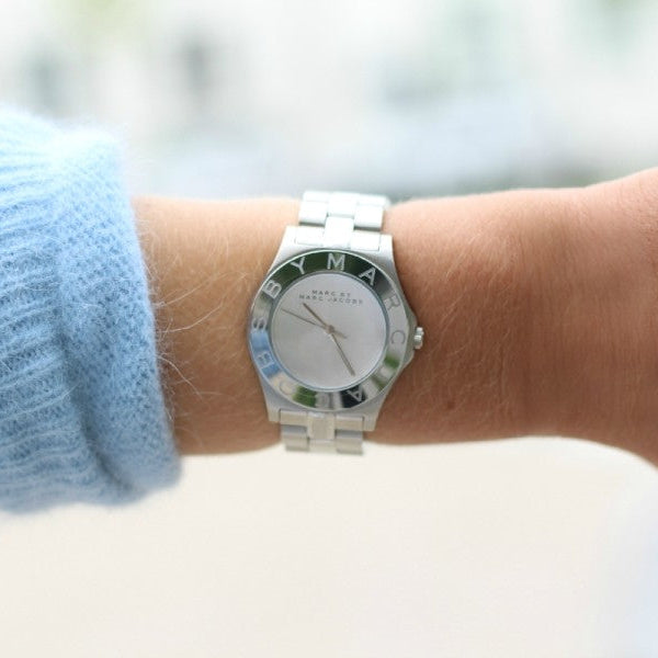 Stainless steel case with a stainless steel bracelet. Fixed stainless steel bezel. White dial with silver-tone hands. No markers. Dial Type: Analog. Quartz movement. Scratch resistant mineral crystal. Pull / push crown. Solid case back. Case diameter: 36.5 mm. Case thickness: 10 mm. Round case shape. Band width: 18 mm. Deployment clasp with push button release. Water resistant at 30 meters / 100 feet. Functions: hour, minute, second. Casual watch style. Marc by Marc Jacobs Blade White Dial Stainless Steel Ladies Watch MBM3125.