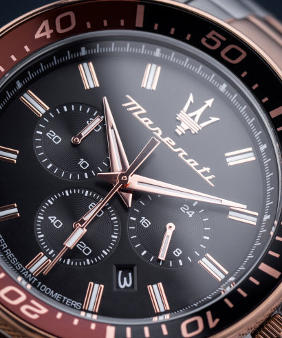 Classic, sporty, chronograph. Chrono Sfida Watch - Black Dial. Maserati Sfida Collection: elegance and rigour, watches with a clean and refined style, characterized by a well-defined classic and sporty look, original creations that reinterpret, in a modern key, the canons stylistics of the sporty elegance of the House of the Trident. MVT Chronograph - 44 mm round steel case, rose gold-plated Black dial Steel bracelet