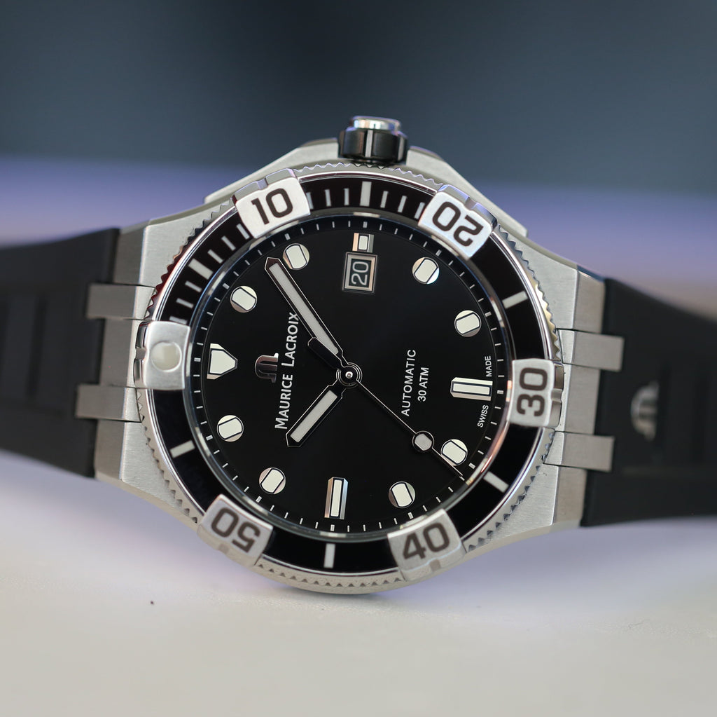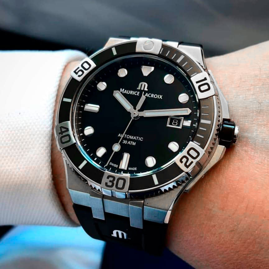 Maurice Lacroix Diver Automatic Aikon Black Dial AI6058-SS001-330-1 Men's Watch The beautiful design of Maurice Lacroix's house is very rare on the market, with a sporty, masculine style on your hands. Beautifully brushed black dial, luminous hands, ML115 movement with 26 jewels, 28,800vph and 38h power reserve.