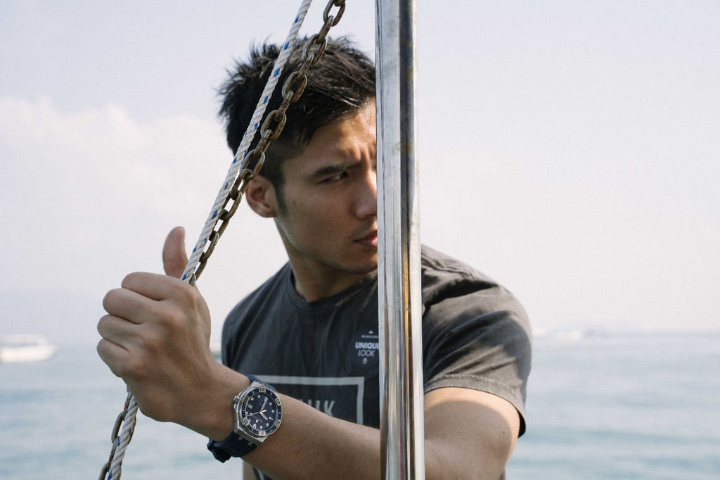 One of the most significant visual changes that distinguishes it from the traditional Aikon is the aquatic inspired smooth finish, instead of the ‘Clous De Paris’ finish on the Aikon Automatic. The hour markers are circular in shape, but each features a deep rectangular cutout that neatly mirrors the long stripes of luminous paint on the sword hands. The contrast between curved and straight surfaces echoes a neat theme throughout the Aikon line. The hands are also lume coated which is an important feature for dive watches. The legibility of the hands is great.